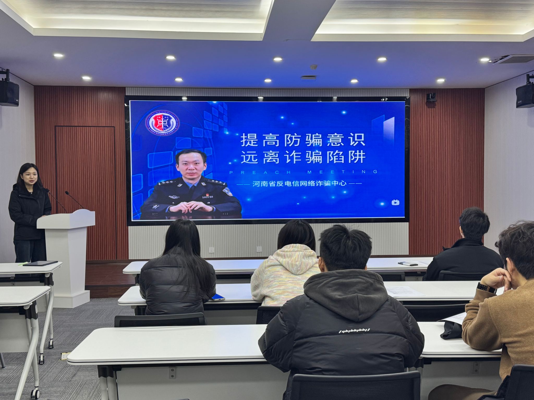 接下来,河南省反电信网络诈骗专家、郑州市公安局反诈宣传大队教导员相冰通过专题视频为同学们解析了诈骗的多种形式和防范技巧。视频中通过丰富的案例展示了诈骗分子如何通过技术手段和心理操控设下圈套,帮助同学们掌握了如何识别诈骗电话、短信和网络信息。此次活动还发放了图文并茂、内容简明的反诈骗宣传单,介绍了常见诈骗手段的识别方法以及防范措施,方便同学们在遇到可疑信息时及时举报和求助。