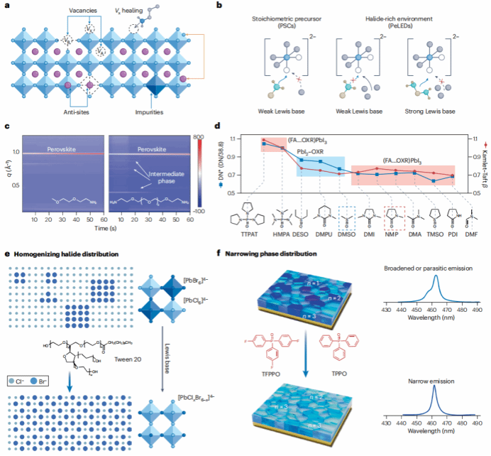路易斯碱在PeLED开发中最常见的应用包括它们作为分子添加剂的使用。从根本上说,这些分子通过直接与离子缺陷结合来实现钝化或通过主动调节钙钛矿结晶过程来工作。在晶化控制方面,它们的功能在于改善晶体质量,抑制晶粒生长过程中缺陷的形成或调节结晶动力学和控制局部组成和相分布的途径。从结果来看,钙钛矿中的路易斯碱的作用,包括缺陷钝化和结晶控制,是由它们的碱度和它们与钙钛矿前驱体的选择性相互作用决定的。