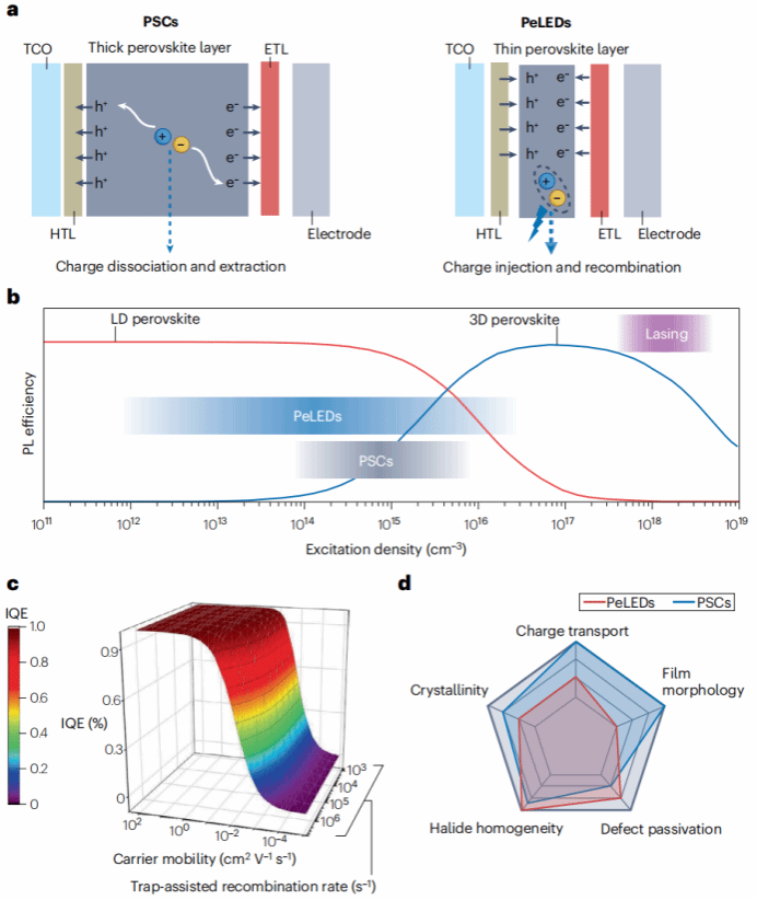 路易斯碱性分子在钙钛矿光电子学中具有重要的调节薄膜质量和提高薄膜性能的作用。然而,它们的使用在钙钛矿太阳能电池(PSCs)和PeLEDs之间有很大的不同。钙钛矿光吸收剂和发射剂都需要低缺陷密度来抑制非辐射损耗。二者不同的工作原理导致了不同的材料设计要求,包括适当的钙钛矿层厚度和定制的载流子动力学。