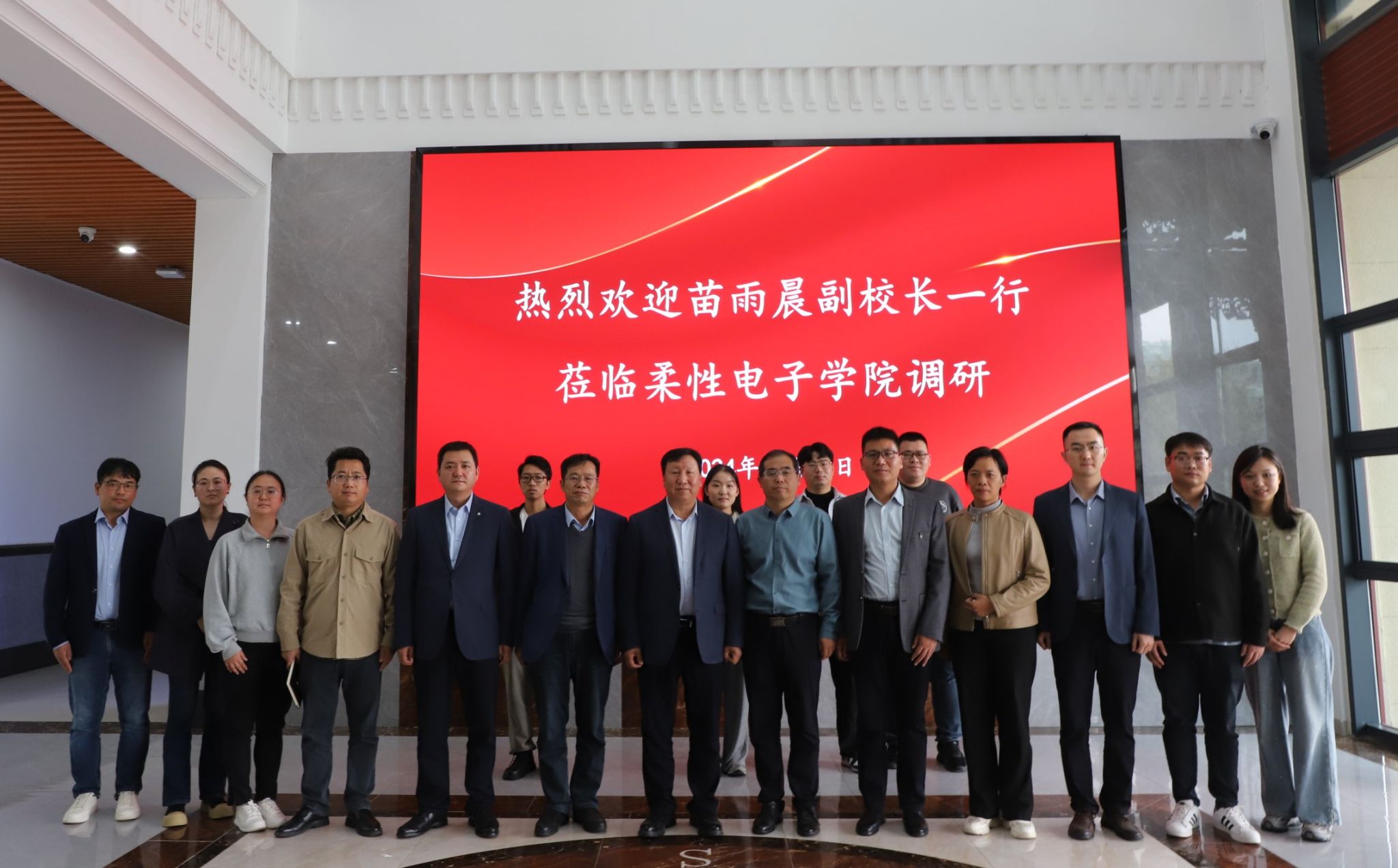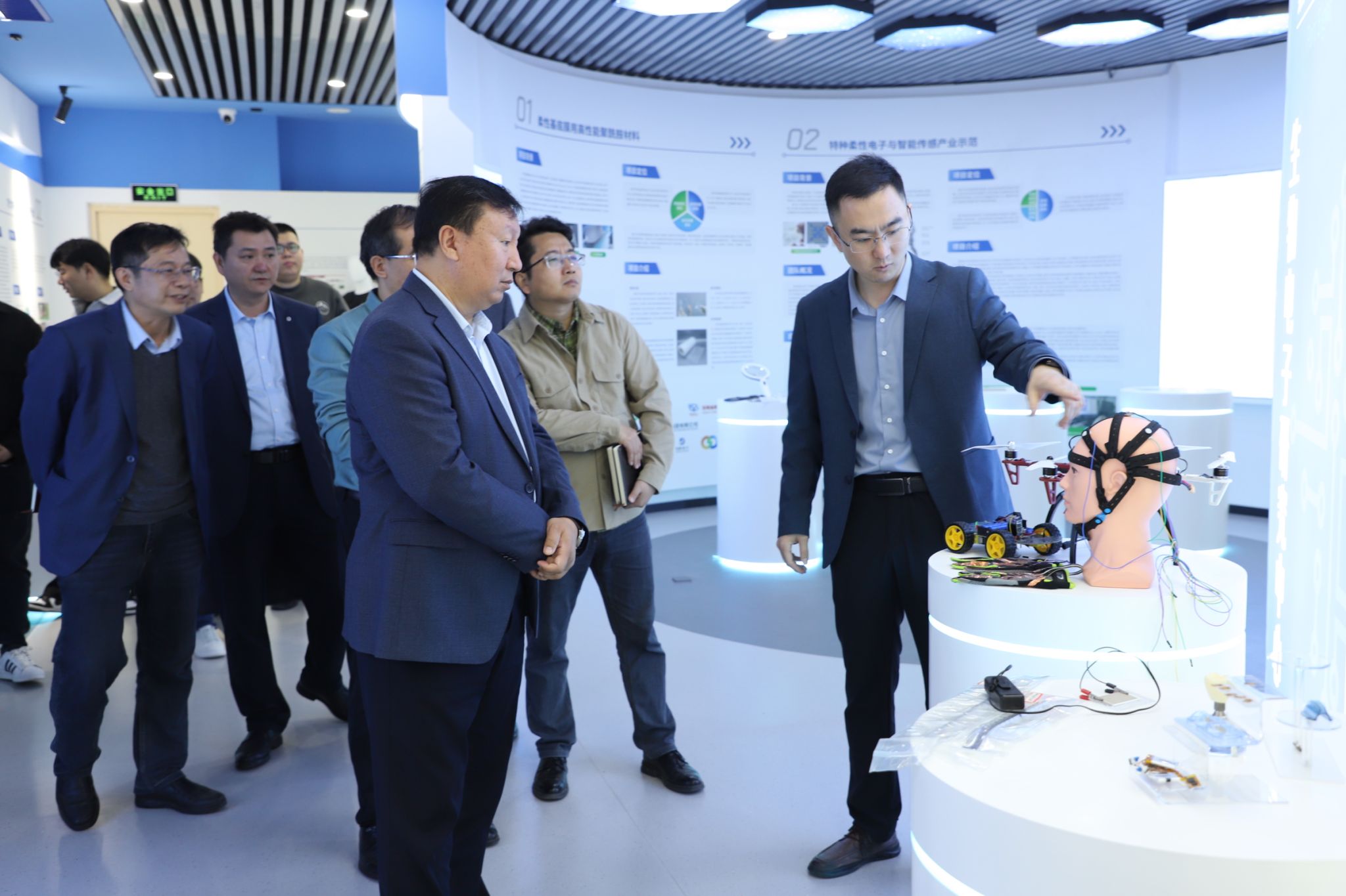 在柔性电子学学科展厅,苗雨晨一行听取了柔性电子学院院长助理张洪健对我校柔性电子学科发展历程的详细介绍,以及在显示照明,先进能源,健康医疗,特种电子等前沿领域所取得的显著成就和进展。此外,还实地考察了生物电子中心、健康电子中心等科研平台。