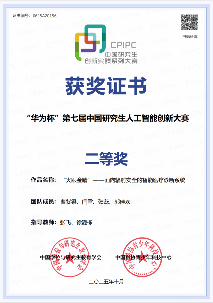 2025年10月28日-30日,由教育部学位管理与研究生教育司指导,中国学位与研究生教育学会和中国科协青少年科技中心共同主办,中国海洋大学承办的“华为杯”第七届中国研究生人工智能创新大赛全国总决赛在青岛落幕。本届大赛共吸引了全国数百所高校的数千名研究生组队参赛,报名3421支队伍。经初赛评审,共252支参赛队伍入围全国总决赛。经过多轮严格评审与精彩角逐,在我院张飞老师指导下,由我院曹紫梁、闫雪、郭佳欢、张蕊共同组成的参赛团队(团队名称:小飞侠队)荣获全国二等奖。这是我校在本次该项高水平赛事中的最好成绩。