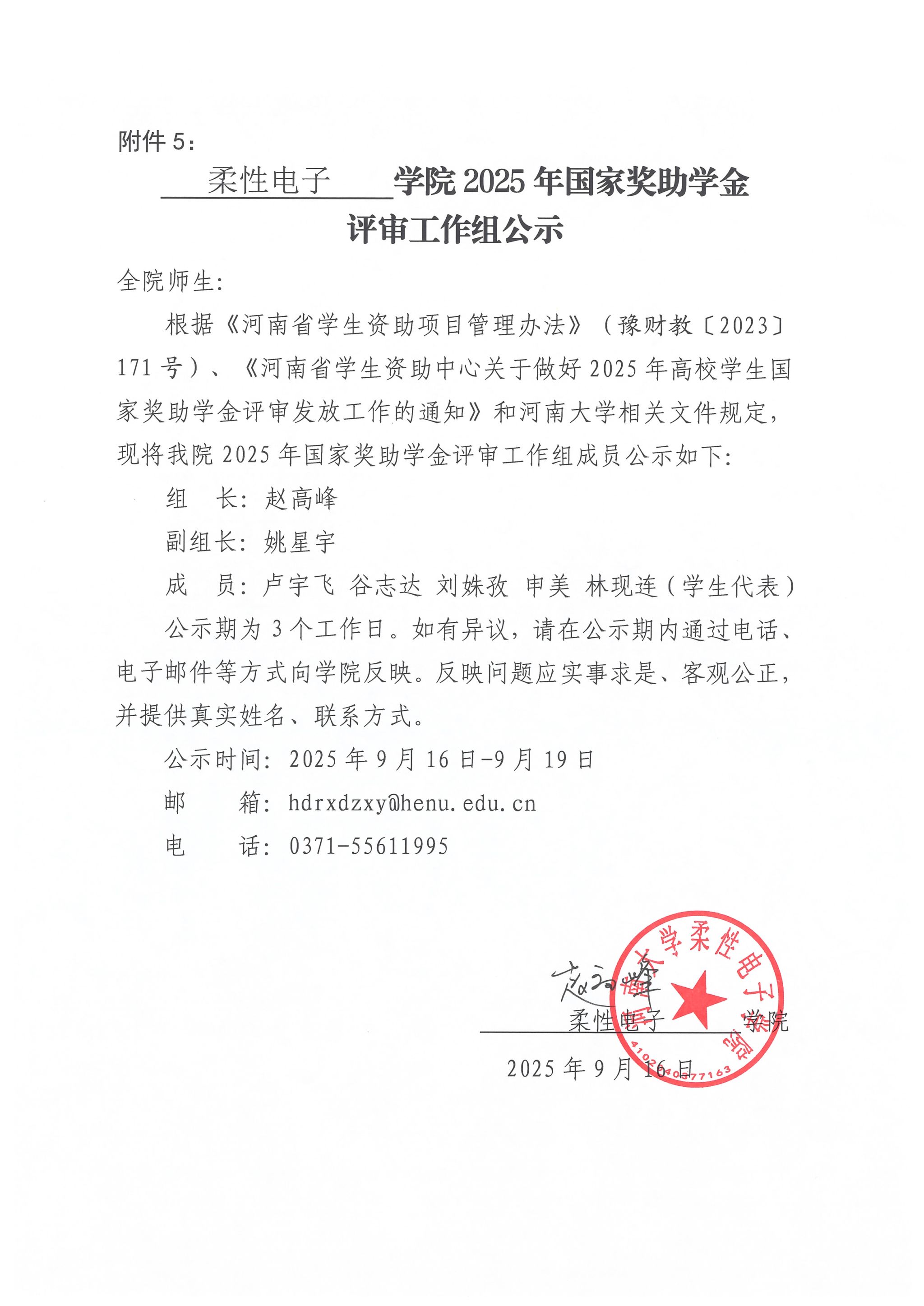 柔性电子学院2025年国家奖助学金评审工作组公示